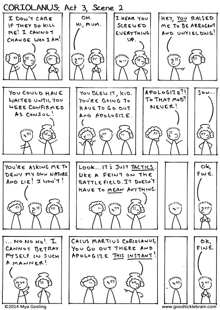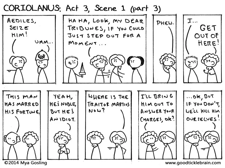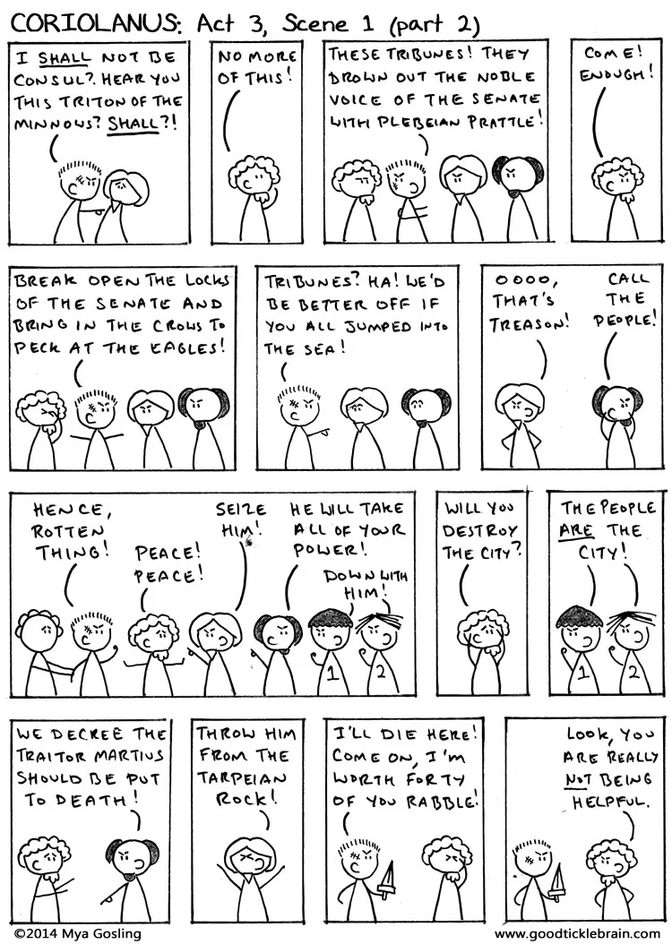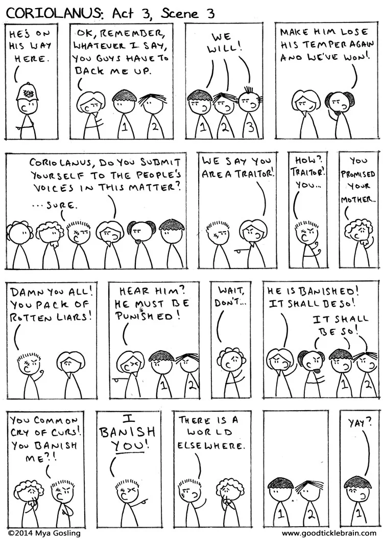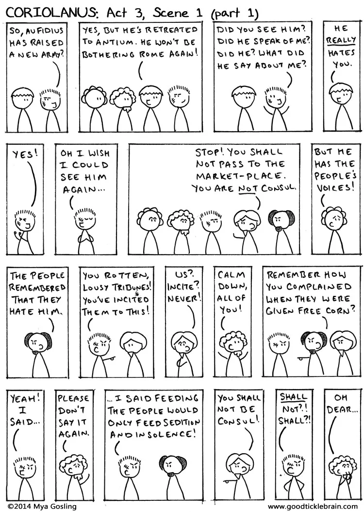 This was a really difficult scene to cartoonify, as it is mostly people ranting furiously at each other, but one of the great moments is when one of the lowly tribunes tries to tell Coriolanus what he "shall" do. The resulting diatribe is scathing.