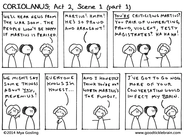 Here we have another one of Coriolanus's little tantrums, as he storms out of the senate rather than sit and listen to himself be praised. I mean, it's all admirable and stuff not to want people to make a big deal of what you perceive as just being your job, but Coriolanus really does manage to take this attitude into new levels of petulance.