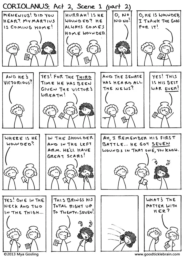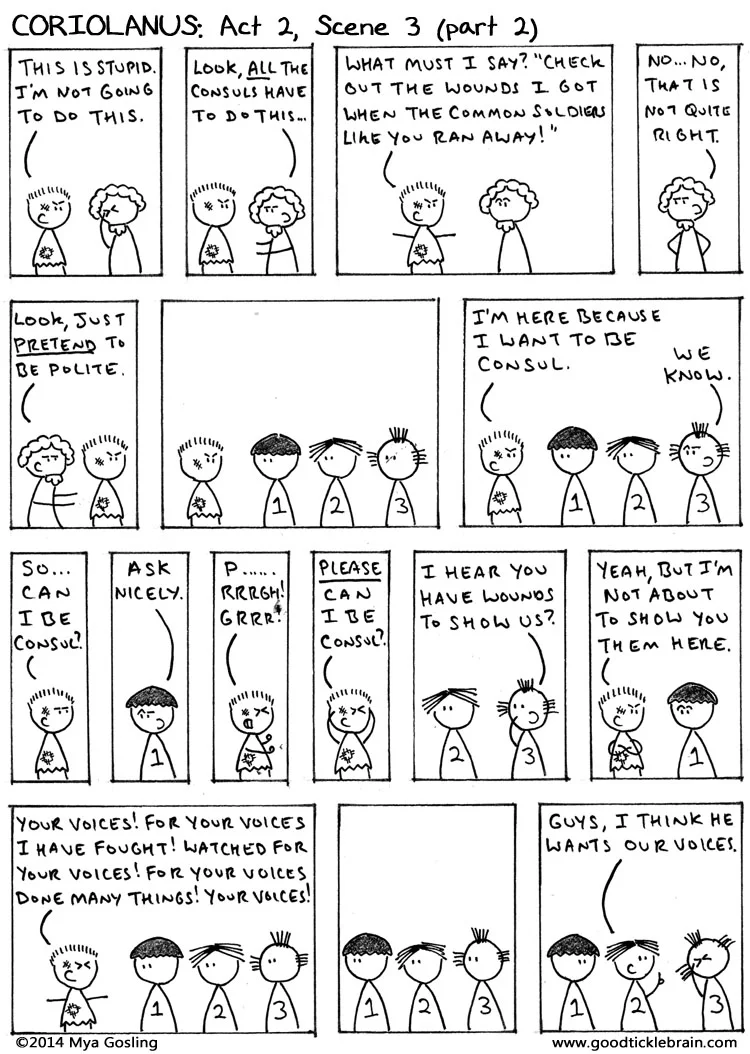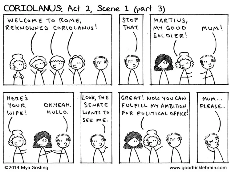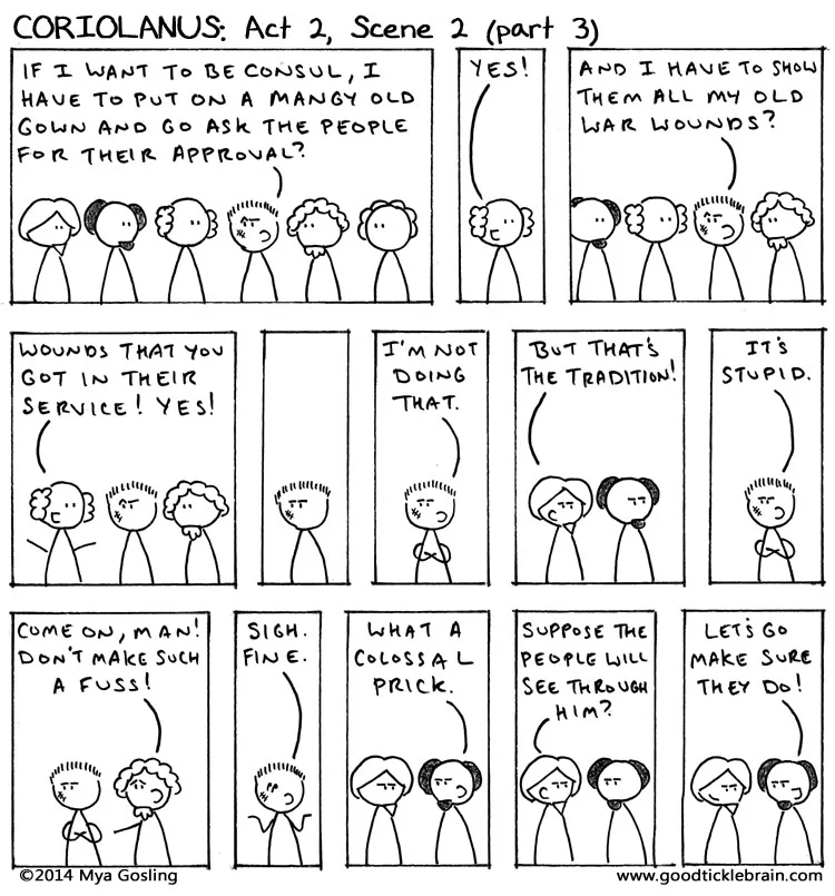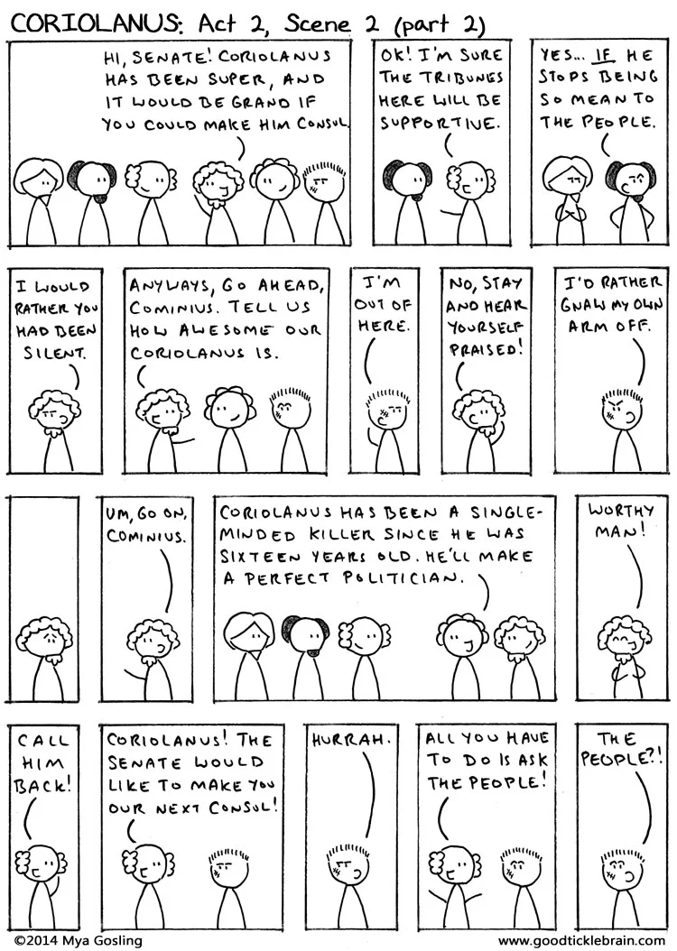 Also, Cominius has a great speech about how Coriolanus is a fantastic solider and is really good at killing people, but he never once says anything remotely resembling "Oh, and he'd be a really good civilian administrator". Apparently that's not a required skill.