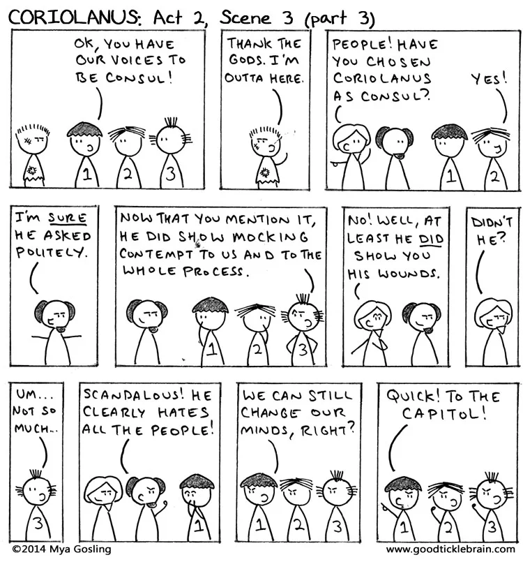 Of course, just when it looks like Coriolanus has gotten away with it, the tribunes come back and remind everyone that they're always complaining about how much Coriolanus hates them, and that actually, yes, he wasn't very nice when he asked us for our voices, was he? Now, I try to stand up for the common people as much as possible, but in this case they really are a lot like sheep, instantly following whoever was the last person to speak to them.